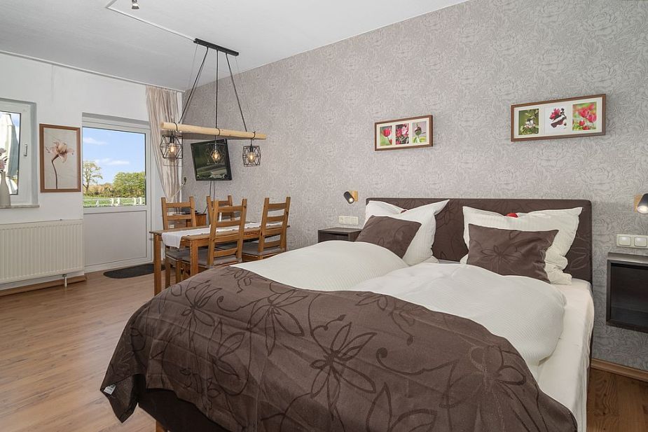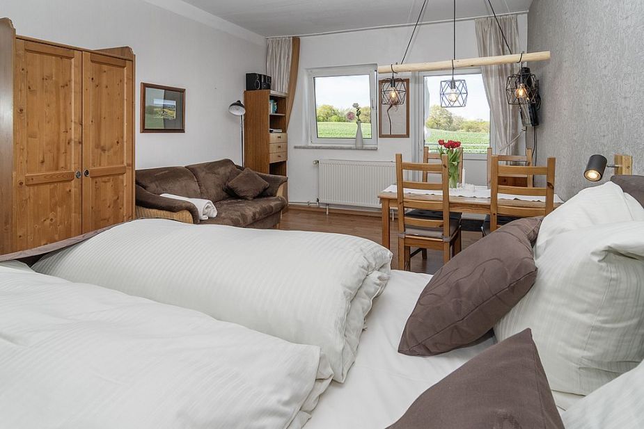Der Wohn- und Schlafbereich ist jeweils mit einem großen Doppelbett, einem gemütlichen Sofa sowie einem Flat-TV ausgestattet. Die beiden Duschbäder sorgen für einen erfrischenden Start in den neuen Urlaubstag. Unser Zimmer Feldkante verfügt über einen Esstisch für 4 Personen. Von hier aus gelangen Sie auch auf den sonnigen, möblierten Balkon mit tollem Blick in die Natur und unsere Felder.