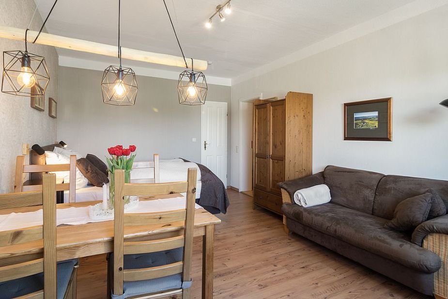 Hier wohnen Sie in zwei großen Zimmern, zwei Bädern und einer Küche, der Balkon öffnet den Blick auf unsere Kulturlandschaft, so erklärt sich auch der Name!